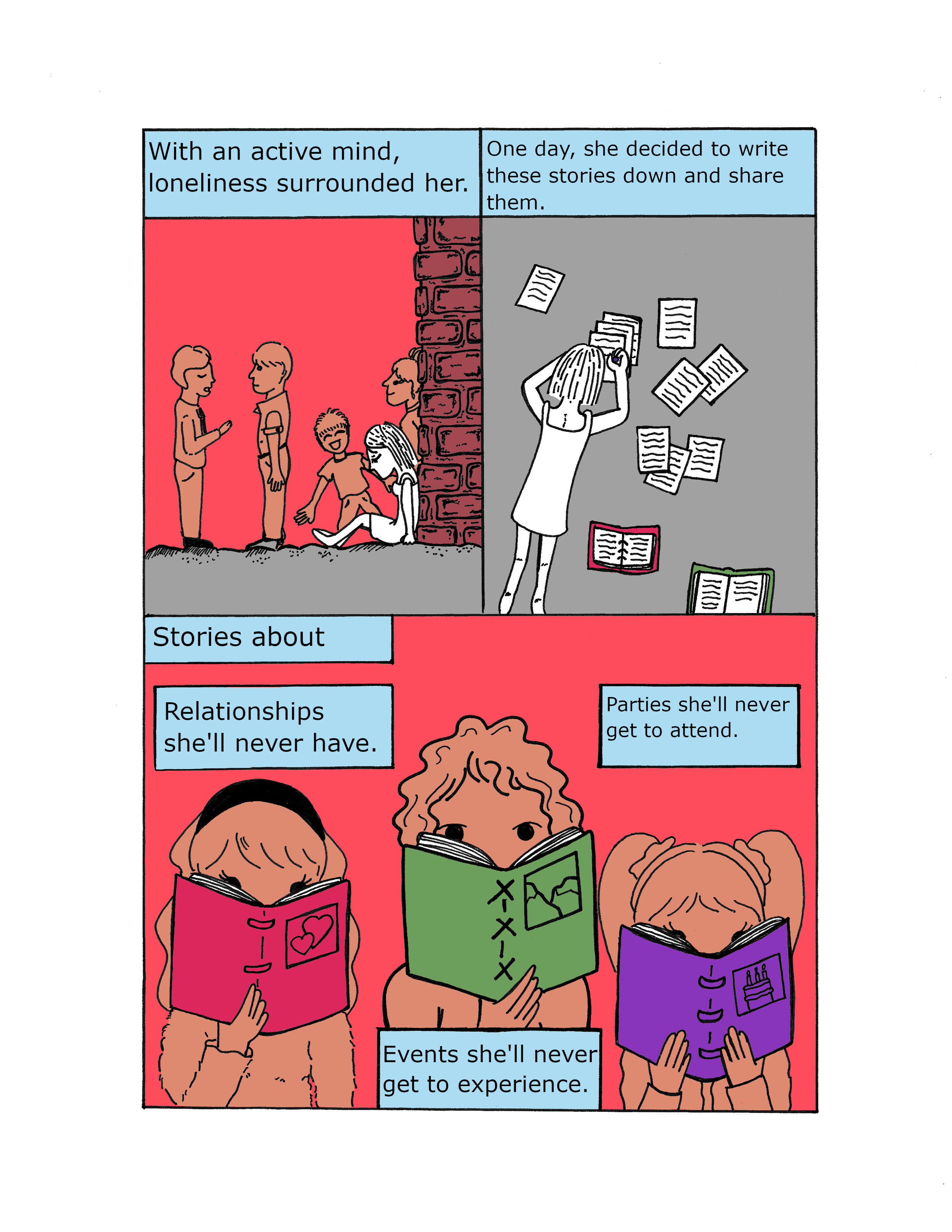 I wrote and drew this comic during the pandemic. I had the idea for the comic for a while, so I had some downtime and created it. The comic was made on no-show manga paper, ink and digitally edited and colored.
